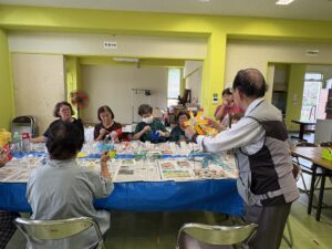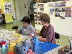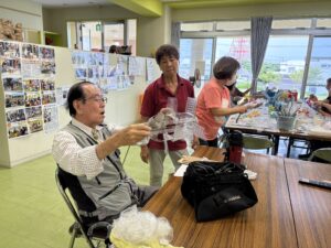 ”ペットボトル風車”を花友会の与儀会長らに教えた渡嘉敷さん(80代)もアドバイザーで参加して交流♪「風を受けやすくするためには工夫が必要だよ」と他の参加者へ教えてくれました♪