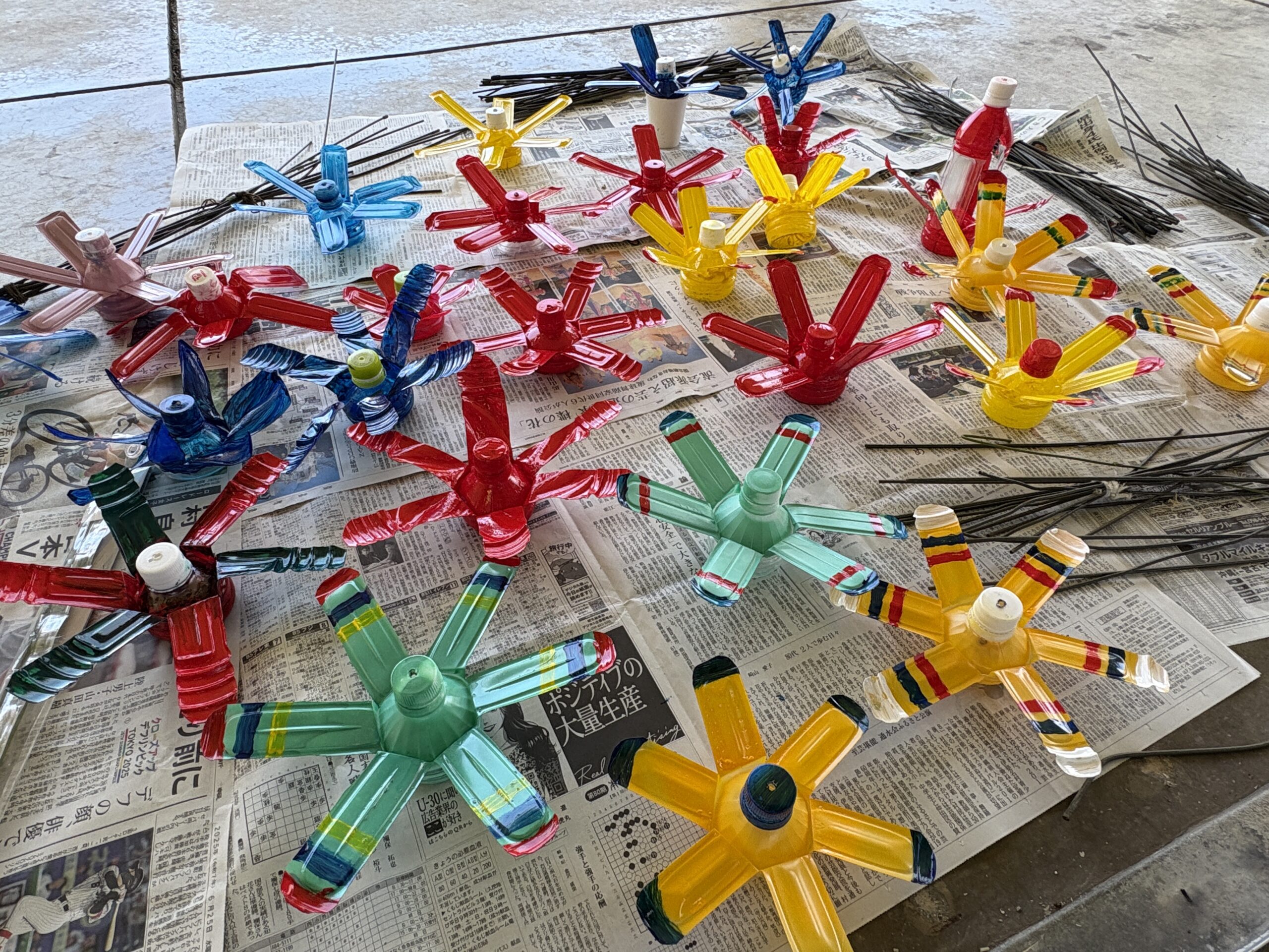 出来上がったペットボトル風車(花友会の花壇に設置予定だそう)