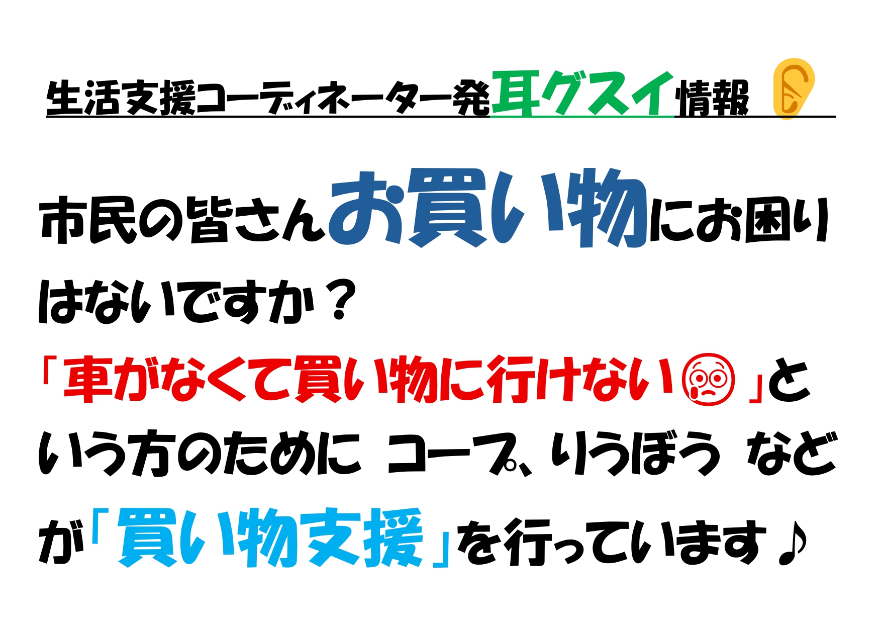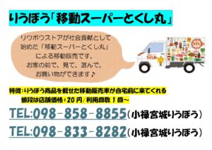 10月 30 2025 生活支援コーディネーター カテゴリー生活支援, 生活支援コーディネーター 企業の地域貢献「お買い物支援」をご紹介♪ ①リウボウストアが行う移動販売 ②コープ沖縄が行う移動販売&送迎 自分の目で見て選ぶことは、作る楽しさや食べる喜びにもつながります♪地域でお困りなどありませんか? まつり 無事終了しました(とみとみ...