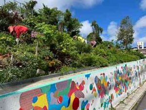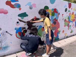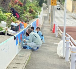昨年夏、花友会の与儀会長から「この壁面を白く塗って子どもたちにイラストを描いてもらったら面白いんじゃない?