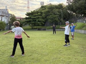 夏休みには親子連れも参加して皆でラジオ体操をしました!(飛行機雲が素敵でした)