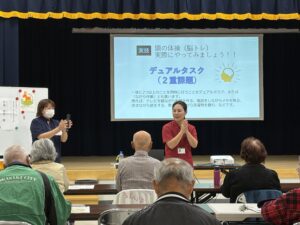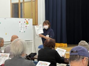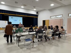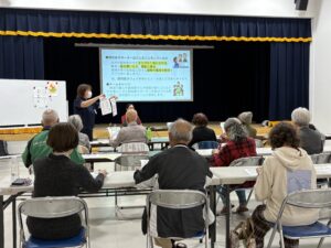 地域包括支援センターおもととよみの杜から講師をお招きして「認知症」について学ぶ皆さん。