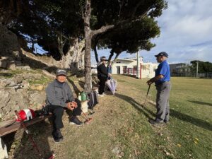 手作りのベンチ「板とブロックを積んだだけだから移動できるよ~」!大会がグラウンドゴルフになると、ベンチを移動して練習に励むそうです