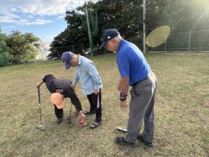 この日「初めてやるさ~」と話す男性がおり、地域の先輩がルールや打ち方を優しく指導