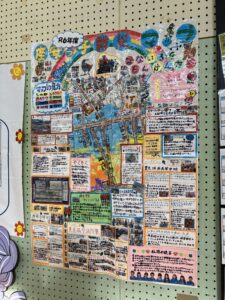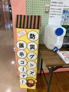 防災グッズ、、座安小学校の子ども達の防災マップ、避難所のトイレなどの展示がありました。