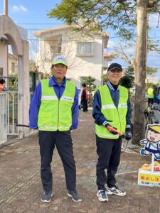 学生ボランティアの皆さんと道路の安全を見守る自治会の皆さん