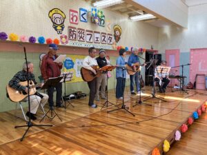 平均年齢70歳のフォークソングサークル「フォーク村」の皆さんと、ニュータウン三線クラブがコラボして曲を演奏。「若い世代も知っている曲を」と、NHK朝ドラ ばけばけ の主題歌「笑ったり転んだり」を披露していただきました。